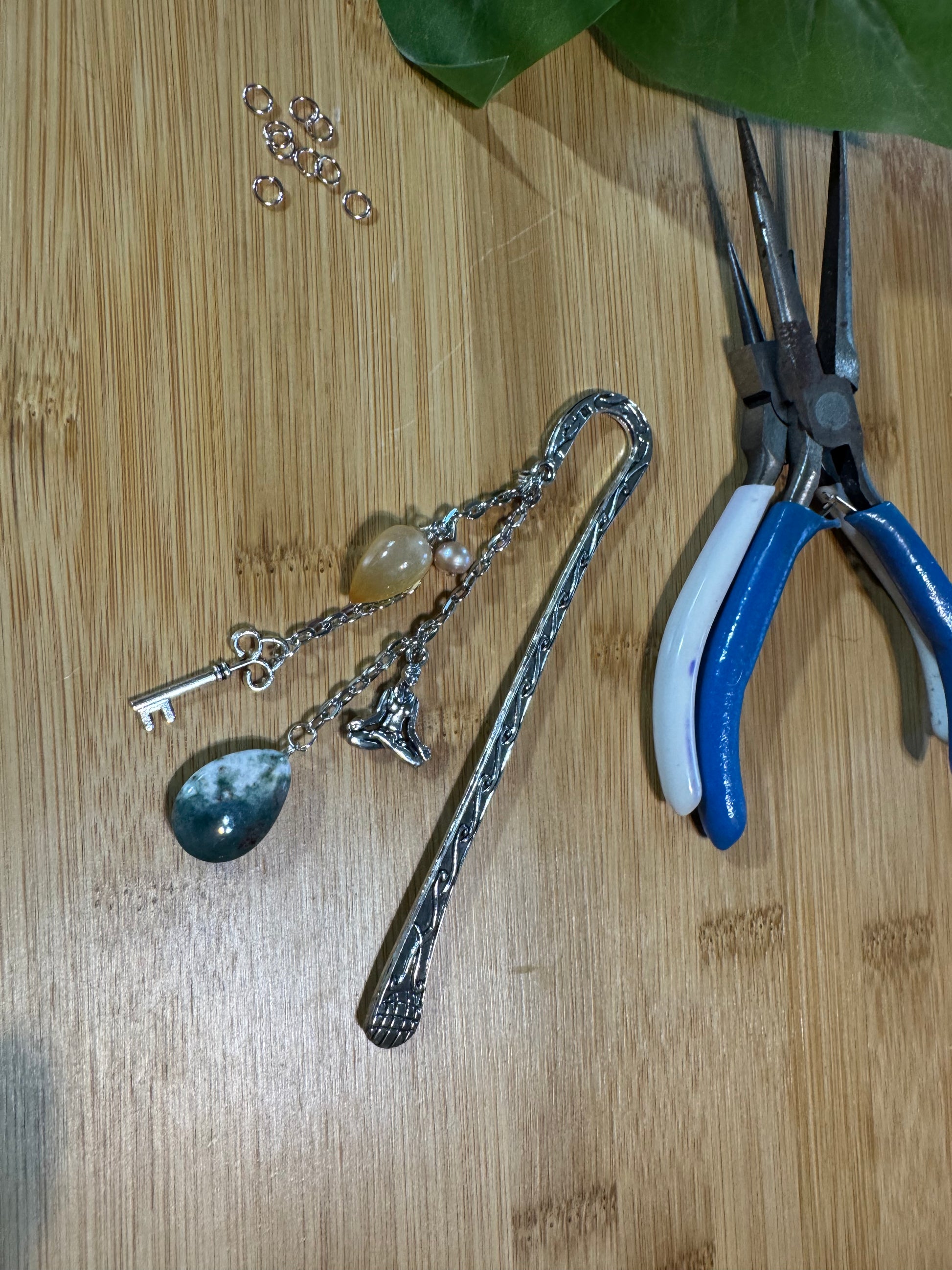 Enhance your reading moments with this enchanting crystal bookmark, thoughtfully designed with natural Moss Agate, vibrant Carnelian, luminous Pearl, and symbolic charms including a key and a divine feminine emblem. This unique piece not only marks your place but also brings layers of spiritual energy, inspiration, and empowerment to your reading journey.