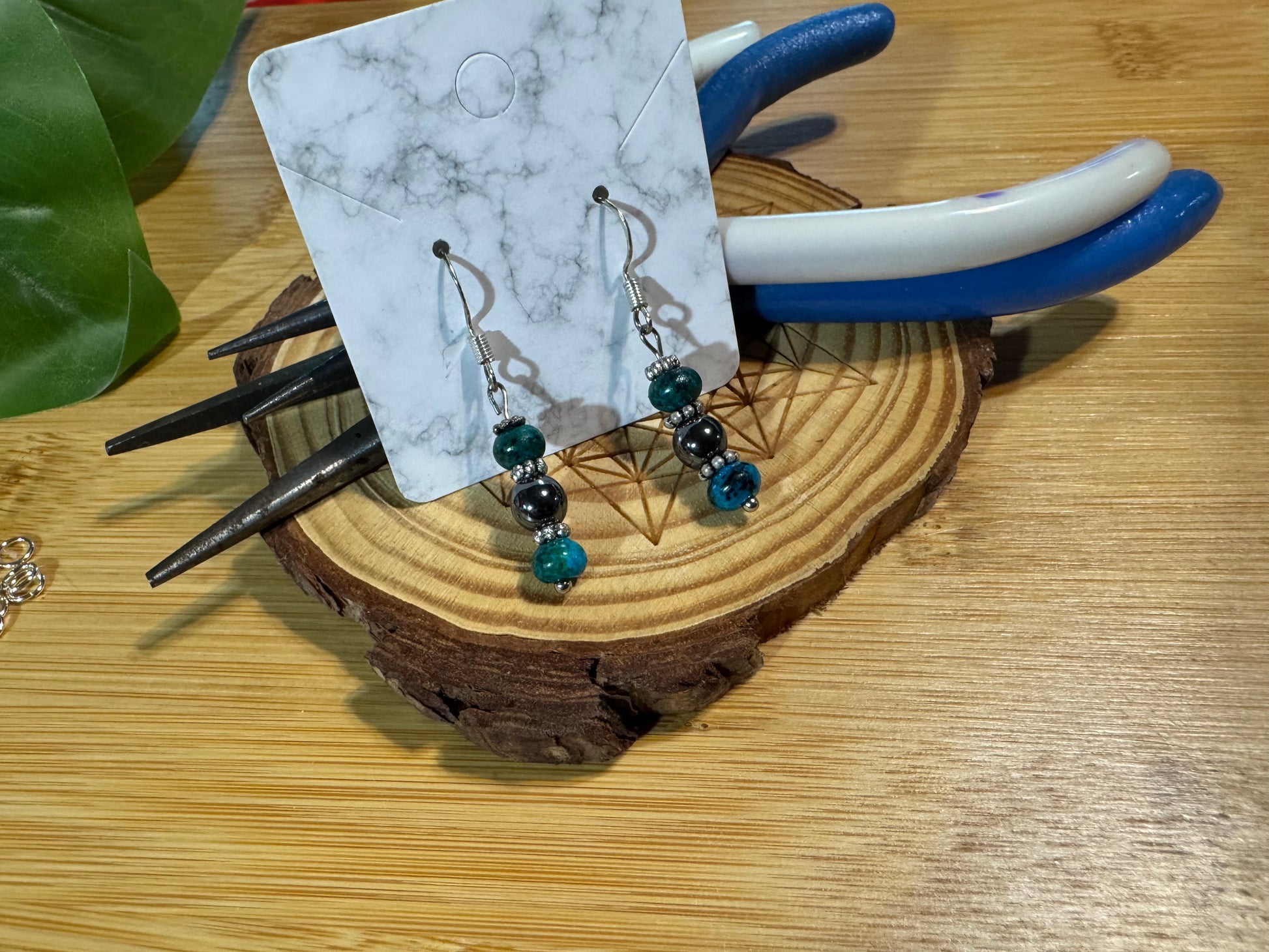 Add a touch of earthy elegance to your collection with these dainty Chrysocolla and Hematite earrings, beautifully crafted with 925 Sterling Silver. Designed to complement a variety of outfits and occasions, these earrings bring versatile style and soothing energy to your everyday wardrobe. Lightweight and timeless, they are perfect for both casual wear and special events, becoming a true staple in your jewelry box.