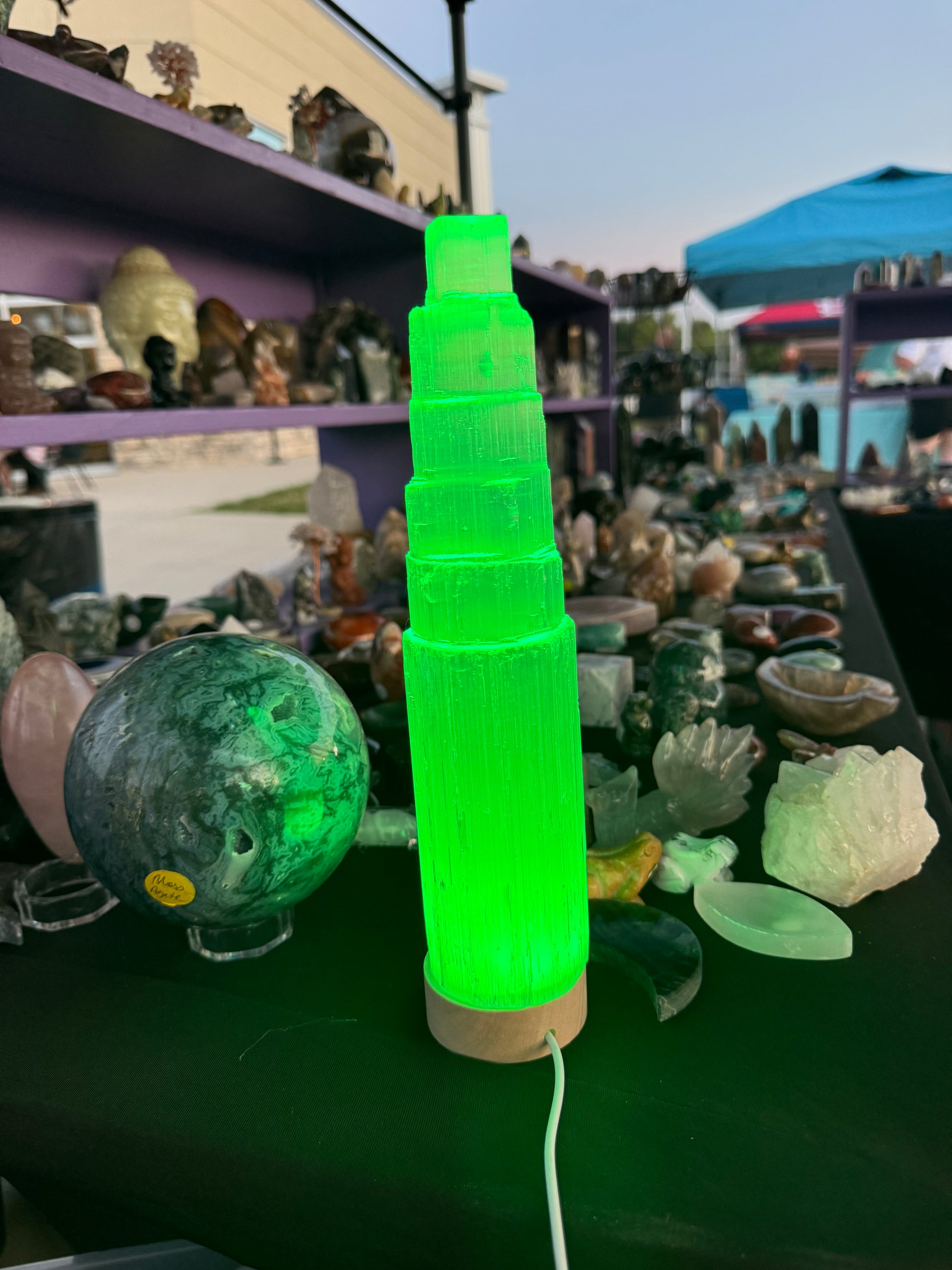 Selenite-clearing mental and emotional tension, strengthening and purifying the physical body, and healing those needing TLC. With a Color changing LED Light Stand.