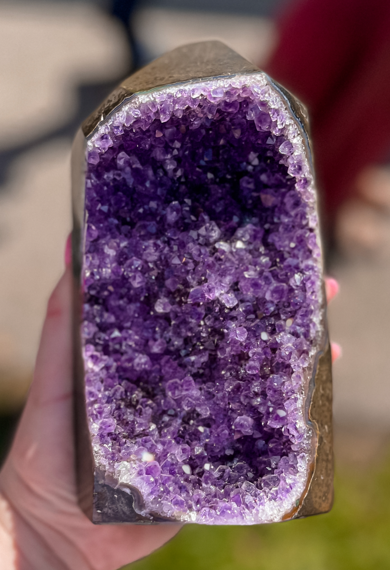 Great locations of cathedral placements are bedroom, office, shared living space like living rooms. Approximately 10” tall, Bolivian cathedral, with deep purple well defined points. Approximately 7 lbs.