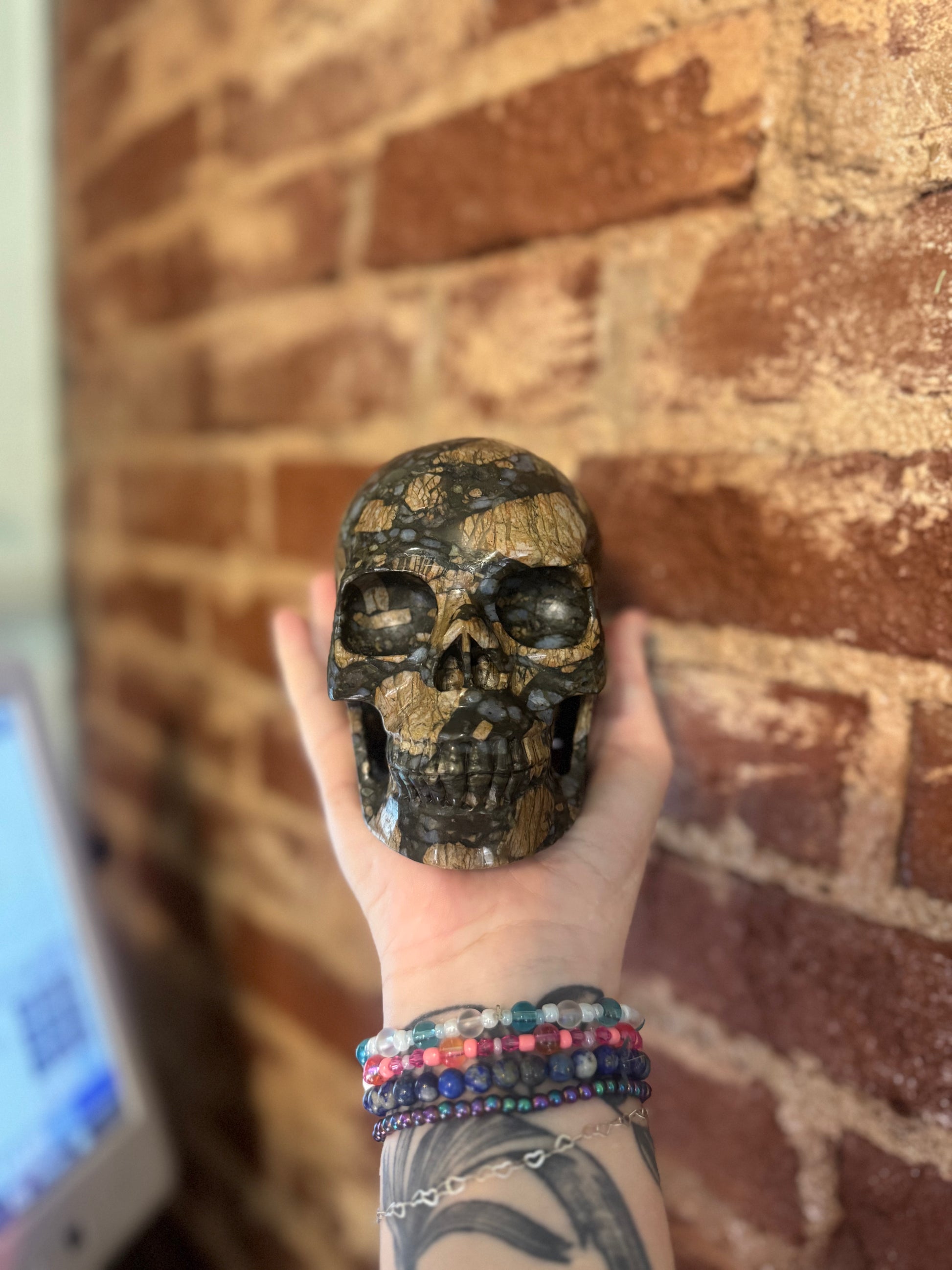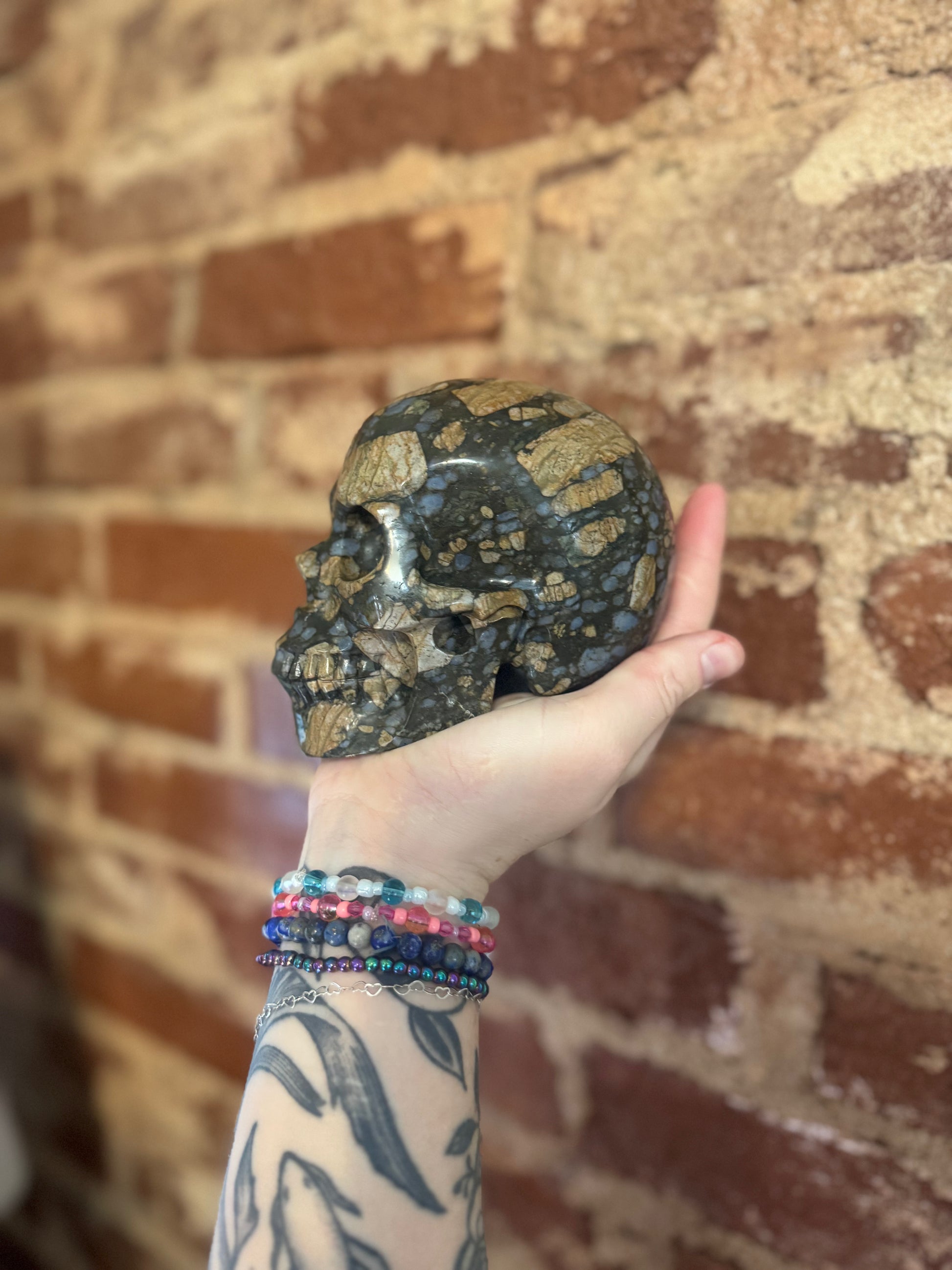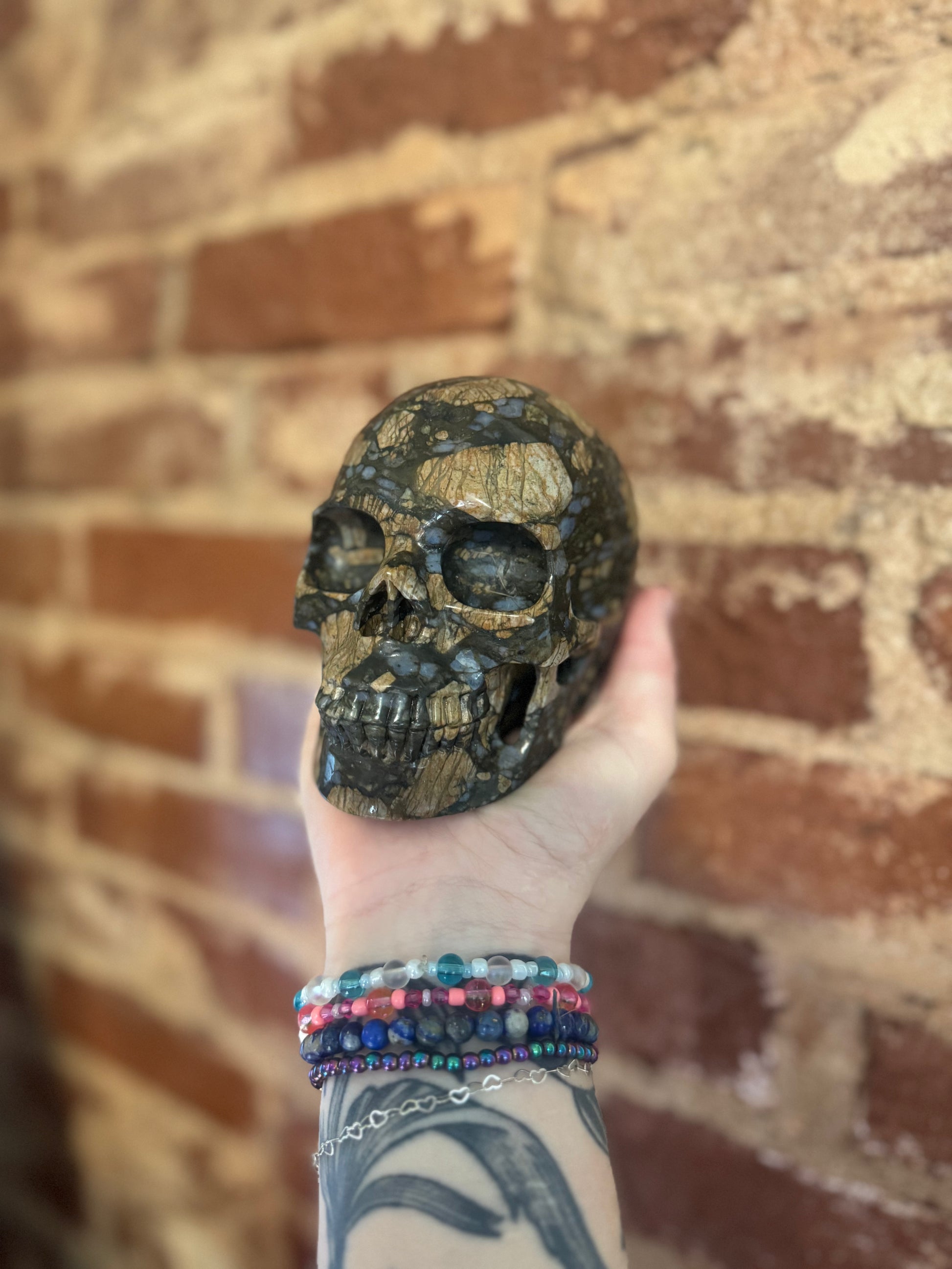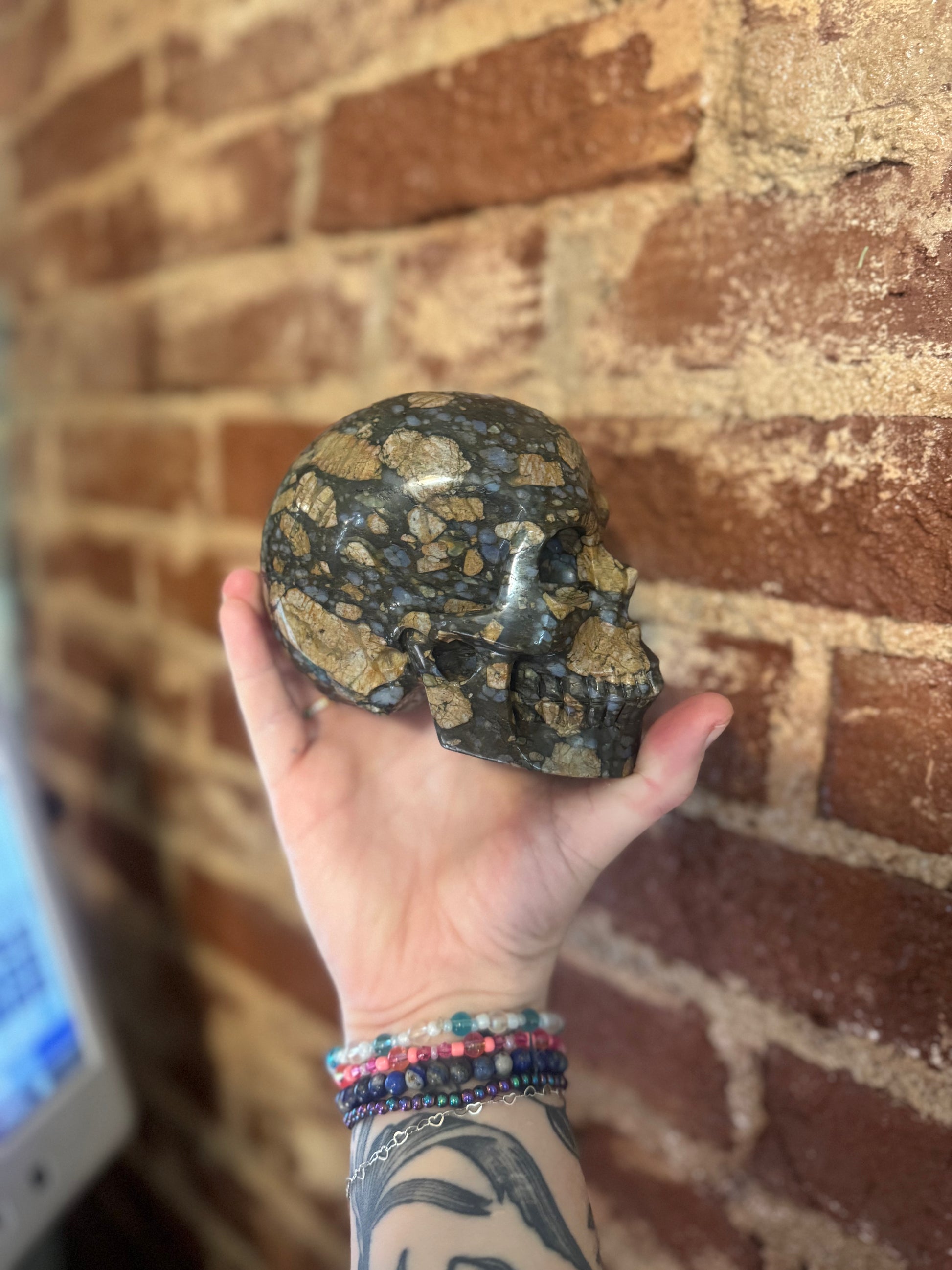 This is a beautiful skull, it is approximately 5.5” front to back and it is 3.75” high. The blue chalcedony inclusions give it a little pop of pretty color.