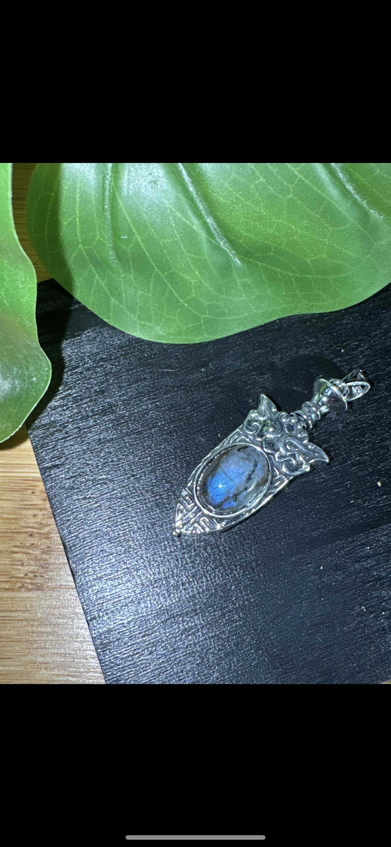 Embody the timeless elegance of a bygone era with this Renaissance‑inspired pendant, featuring a vivid labradorite cabochon in a finely wrought stainless‑steel setting. Whether paired with a flowing gown or a casual blouse, its iridescent flashes of blue, green, and gold will catch the light—and everyone’s eye—wherever you go. Comes with a black silk cord approximately 18” adjustable.