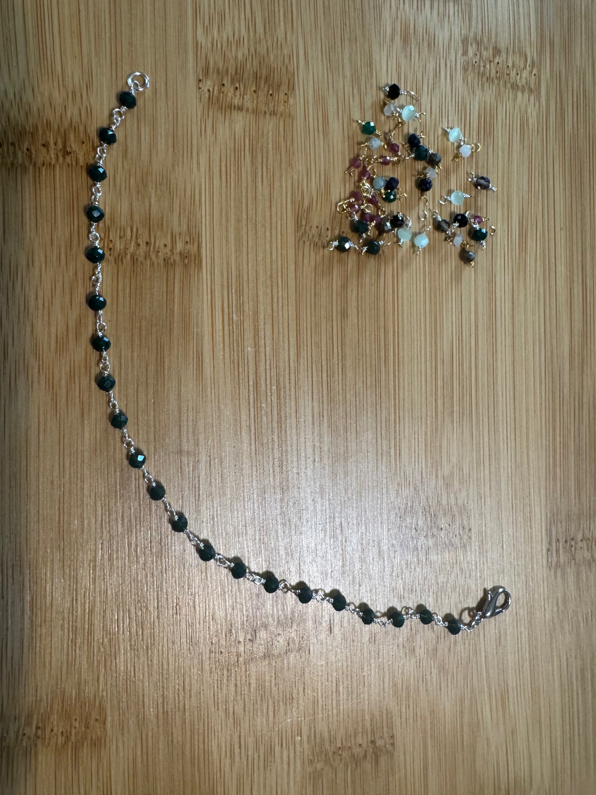 Beautiful and dainty wire-wrapped Deep Green Dioptase bracelet, micro faceted 3.5-4mm beads. Handcrafted in 925 Sterling Silver. lengths available from 6” to 9”. Custom style with adjustable links can be added.